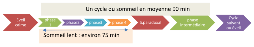 Le dormeur accomplit de 5 à 6 cycles de sommeil de 60 à 90 minutes chacun, ces cycles se succèdent durant la période de sommeil et correspondent à des rythmes cérébraux.