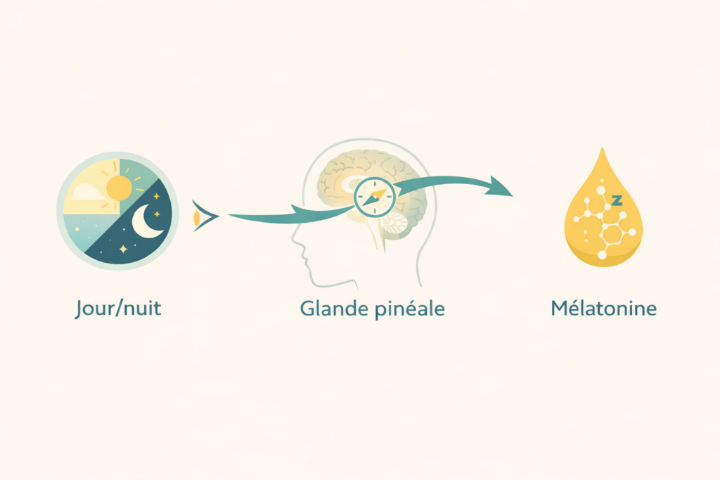 La synchronisation de cette horloge biologique régulant, entre autres, le cycle veille-sommeil avec l’alternance lumière-obscurité suppose que cette horloge puisse détecter les variations d’intensité lumineuse Ceci est rendu possible grâce à la présence dans la rétine de récepteurs spécifiques à la lumière ; en fonction de leur niveau d’activation, la glande pinéale synthétise de la mélatonine selon un rythme circadien entrainé par l’obscurité (un pic vers 3-4h du matin) ; cette sécrétion de mélatonine pourrait participer à la modulation des structures du tronc cérébral qui contrôlent le cycle veille-sommeil, synchronisant ainsi l’organisme avec l’état du cycle lumière-obscurité.